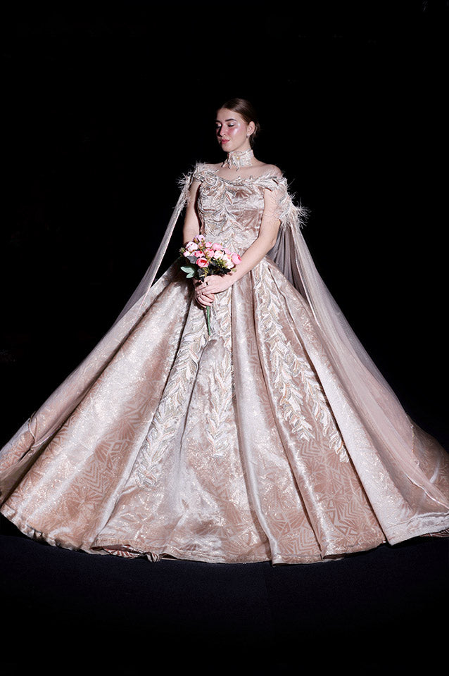 Claret shimmer tulle corseted embroidered gown with hues of metallic golds and electric bronze.It is enhanced with feathered cowl falling posterior drape, its colour is Electric gold, having fabric of Organza tissues Swaroskvi & sequins