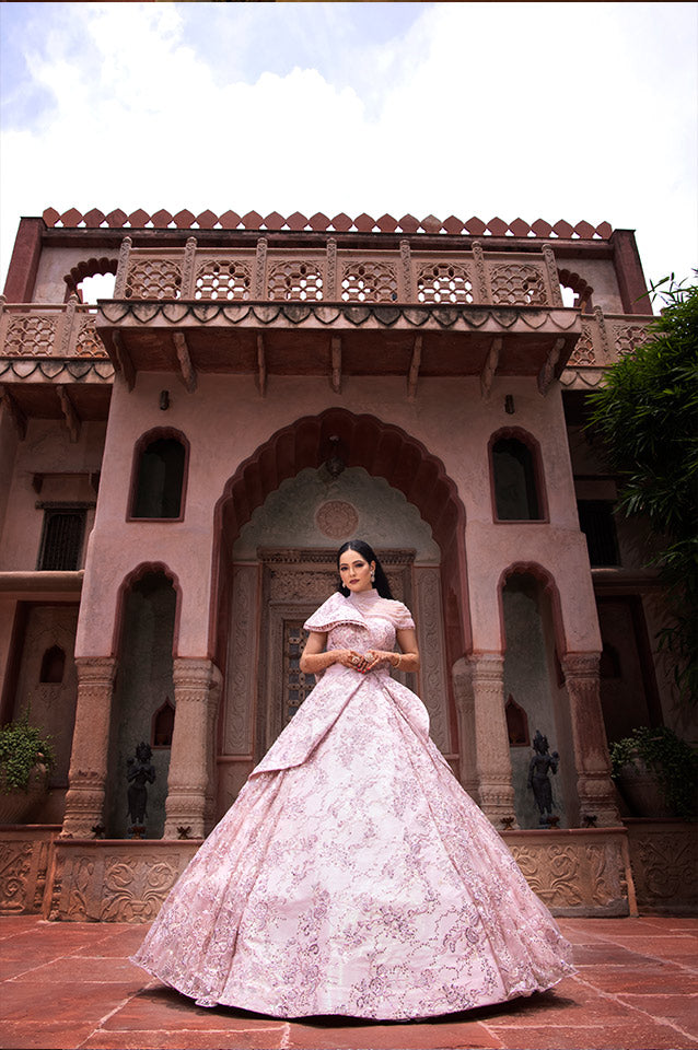 Fluid balance,a sculptural salmon pink gown draped with ruffles,spiralling endlessly.The gown is embellished with fallen crystal at the shoulders, its color is Salmon pink, having fabric of Net Organza & its embroidery is Cutwork threadwork