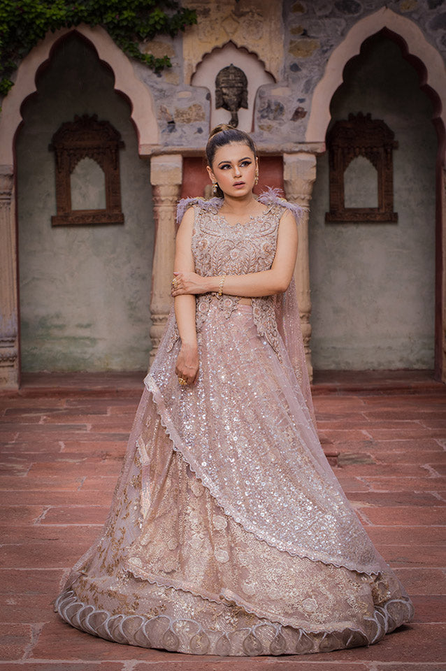 The champagne pink mermaid gown paired with a corset that’s a scattered layer of guipure delicately embellished with sequins,crystals and cut daana.Its colour are champagne pink & its fabric is net organza & embroidary details are sequins,crystals,cut daana sewed with resham threads.
